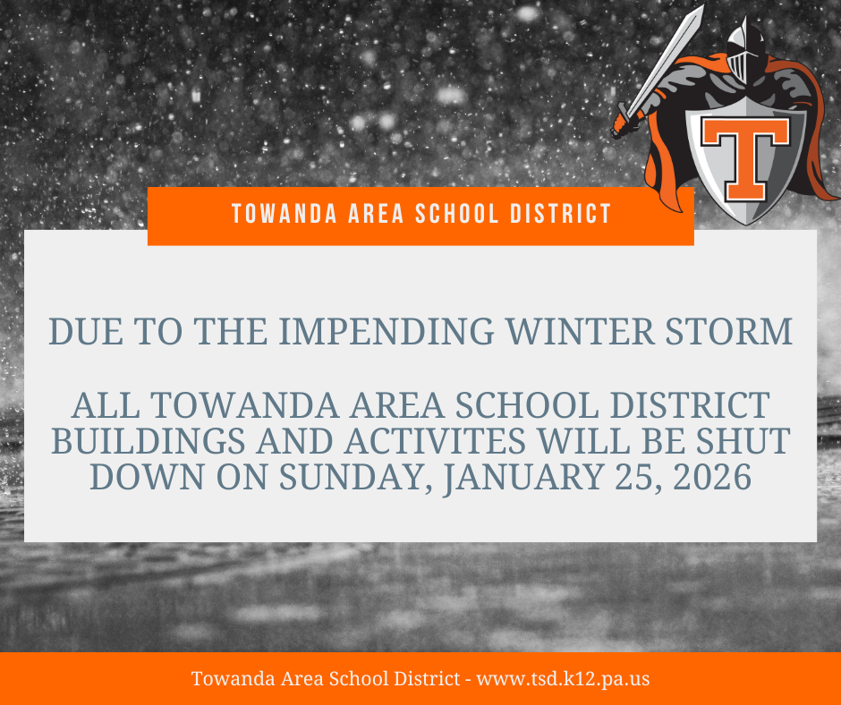 Due to the impending winter storm all Towanda Area School District buildings and activities will be shut down on Sunday, January 25, 2026.
